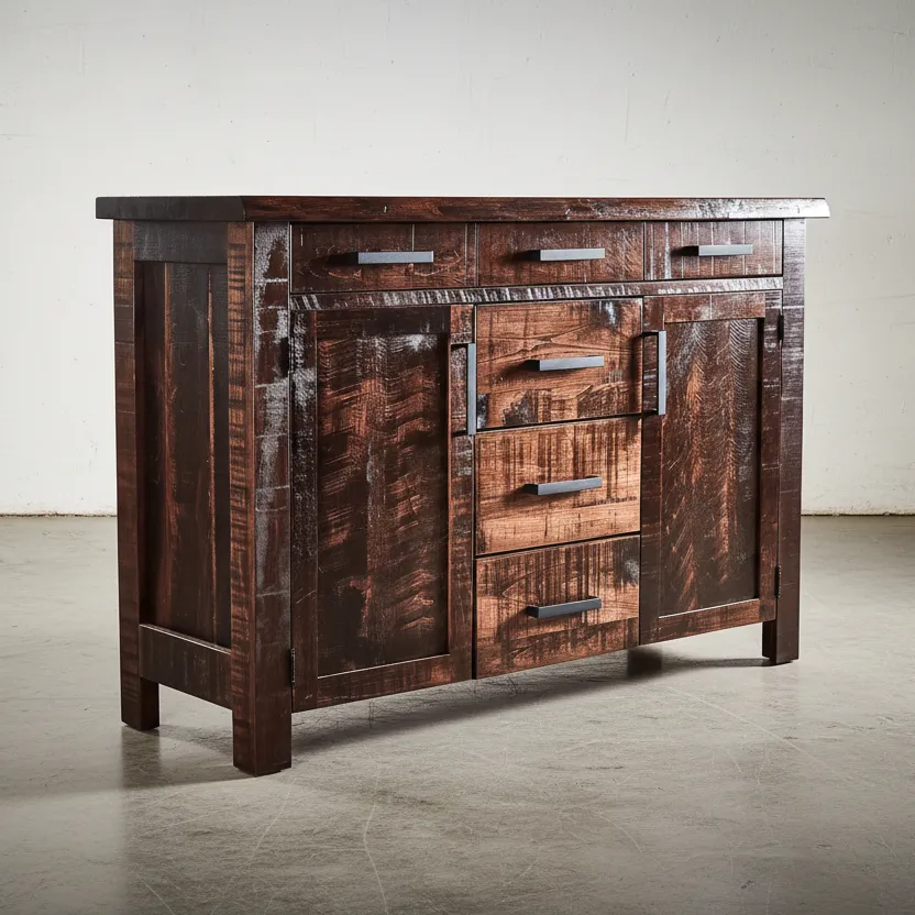 The Arcadia Sideboard – 60 is a testament to enduring design, featuring a robust silhouette and a surface rich with natural texture and subtle imperfections that tell a story. Its substantial presence and refined rustic charm make it a versatile piece, equally at home in a cozy farmhouse setting or a modern industrial loft. The classic lines and thoughtful craftsmanship ensure it remains a focal point for years to come. Designed with both beauty and utility in mind, this piece offers a wealth of storage options to help keep your home organized and clutter-free. Three discreet top drawers are ideal for smaller items, while a central column of three deeper drawers provides ample space for linens, flatware, or other essentials. Flanking these are two spacious cabinet doors, perfect for stowing away larger serving dishes or household items, all adorned with sleek, understated hardware for easy access. Whether gracing your dining room as a buffet, offering display and storage in a living area, or serving as an elegant entry console, the Arcadia Sideboard – 60 brings warmth and character to any room. Its grounded form creates an inviting atmosphere, blending seamlessly with diverse decor styles while providing invaluable functionality and a touch of understated elegance to your home.