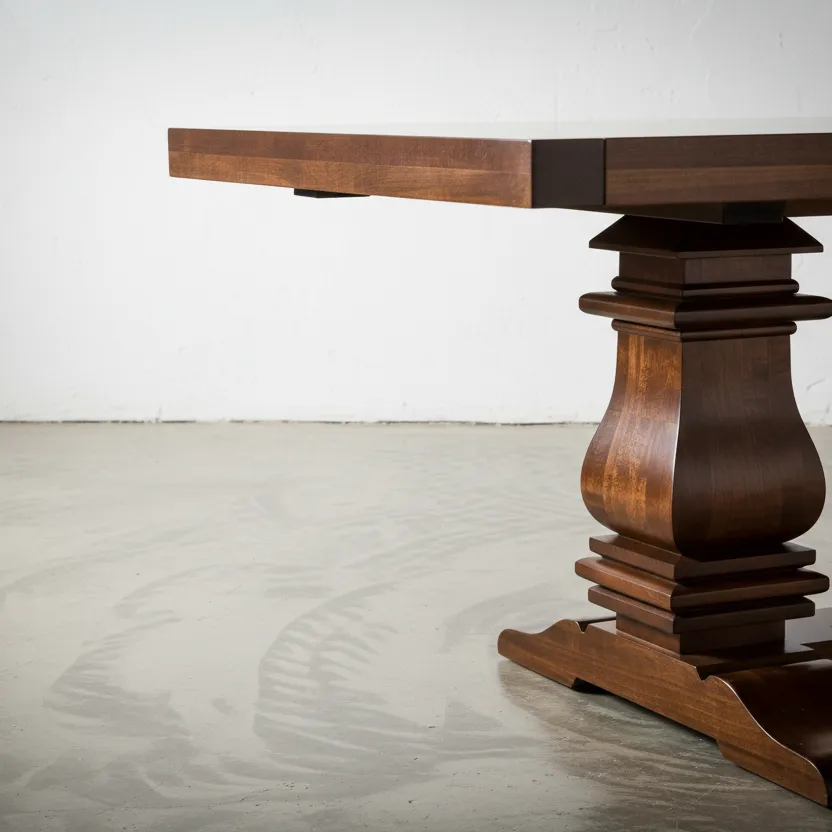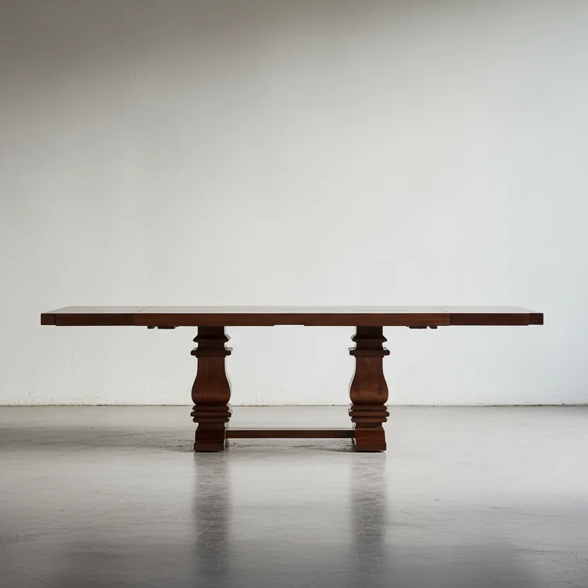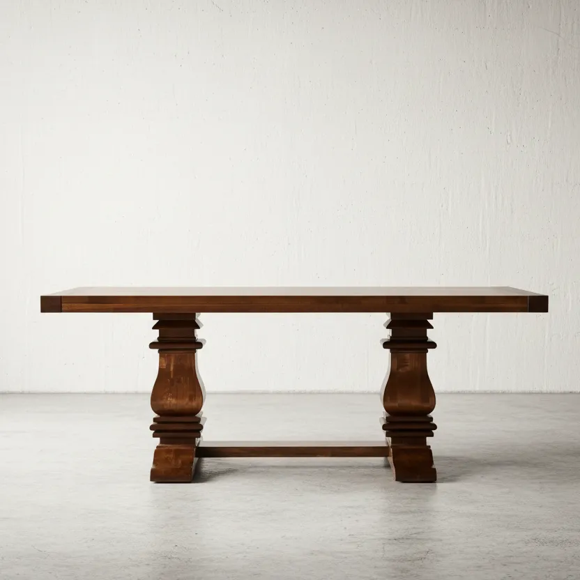 This majestic table, grounded by substantial pedestal bases, offers a timeless foundation for gatherings and grand statements.