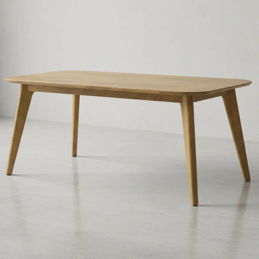 The Karsjo Table presents a harmonious blend of clean aesthetics and functional design. Its spacious rectangular top is gently softened by rounded corners, creating an inviting and contemporary silhouette. This thoughtful detailing establishes a look of refined simplicity, making it a distinguished addition to any home.Supported by four gracefully tapered legs that subtly splay outwards, the table exudes an airy elegance. This distinctive base not only ensures unwavering stability but also contributes to its sculptural appeal, offering a touch of sophisticated flair that enhances the visual flow of your space.Designed for versatility, the Karsjo Table is perfectly suited for both everyday dining and special occasions. Its understated charm allows it to complement a wide range of interior styles, creating a warm and welcoming focal point that encourages connection and memorable moments in your dining area.