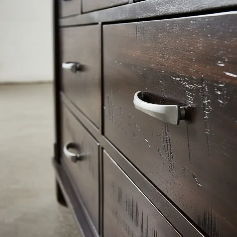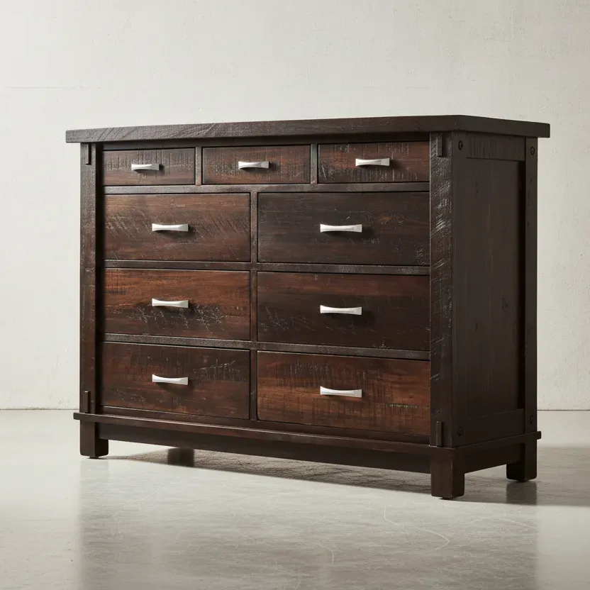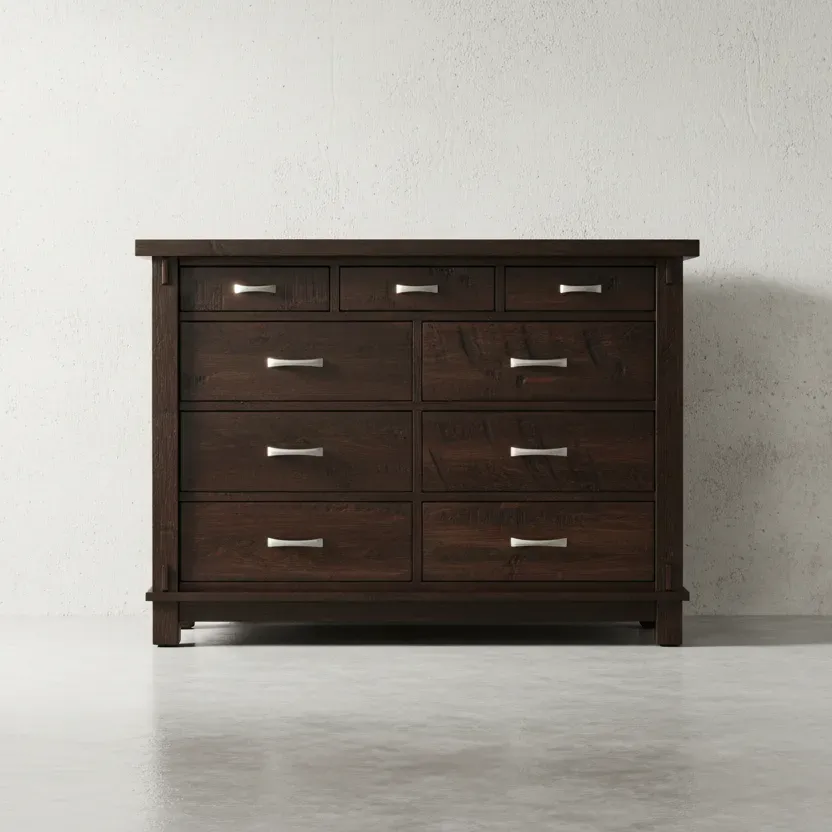 A beautifully rugged, wide dresser that highlights natural wood imperfections, offering a rich, earthy look and extensive storage.