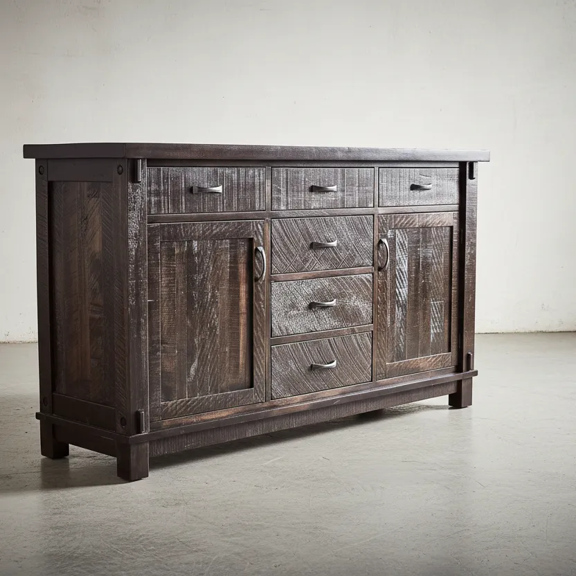 This distinguished cabinet brings a commanding presence and refined character to any room. Its robust form is elegantly balanced by its clean lines and rich, textured surfaces, creating a piece that feels both substantial and inviting. The artistry of its design is evident in every detail, offering a blend of classic charm and contemporary appeal.Thoughtfully designed for both aesthetics and utility, this cabinet features a harmonious arrangement of drawers and spacious cabinet doors. The various compartments provide generous storage solutions, perfect for organizing essentials while keeping your space uncluttered. Complementing the textured facade, the sleek metallic hardware adds a touch of modern sophistication, enhancing its overall allure.Whether placed in a dining area, living room, or spacious entryway, this cabinet is more than just a storage unit; it’s a statement piece. It effortlessly integrates into diverse interior styles, from a cozy traditional home to a sleek modern abode, infusing the environment with warmth, character, and practical elegance.